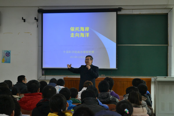 紧接着,秦松研究员用生动的语言为大家讲述了世界海洋事业开发历史、发展现状及前景规划,详细说明了海洋相关专业的重要性和必要性,并提出海洋相关专业的最终要求是改造自然、改善环境、人与自然协调发展。随后,他介绍了中国科学院海岸带研究所在基因海洋、蓝色产业、数字海洋和海岸带等新兴海洋项目方面的战略地位,对中国科学院海岸带研究所的师资力量和科研力量及重点研究项目进行了具体讲解。中国科学院海岸带研究所以“认知海岸带规律,支持可持续发展”为使命,以“创新海岸带科学理论、工程技术与方法体系”为目标,建设海洋科学与技术人才培养基地。