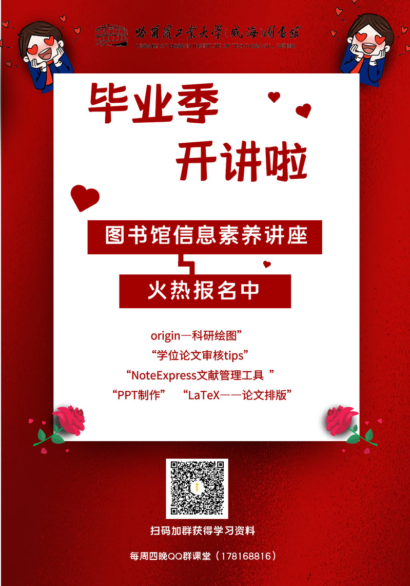 疫情期间为助力我校学子完成毕业答辩,图书馆特别推出“毕业季开讲啦”线上信息素养系列讲座,连续5周,每周四晚七点,共计五场,讲座内容涉及从毕业论文撰写到提交的全流程技能,欢迎大家积极报名。