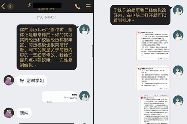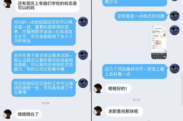 在此次活动中,语言文学学院发展中心首先对17级同学的简历以及16级同学的就业方向进行汇总,并以此为根据进行一对一分组,以便有效地开展指导,使求职同学得到切实的帮助。随后,一对一的线上指导活动有条不紊地展开。16级的就业精英们通过网络通讯平台对求职同学的简历进行了一对一的线上指导,从简历的细节格式、排版设计、内容填充等方面提出了建议,并分享了制作简历的相关技巧与就业求职的相关经验。