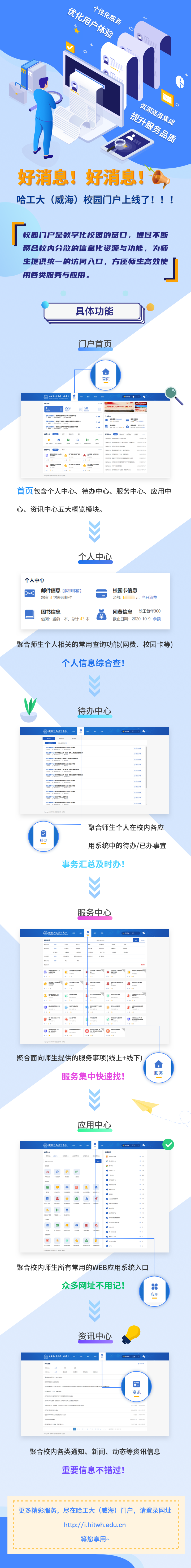 为进一步推进校内业务办理流程向智能服务转型,推行网上审批服务平台和校师生服务中心相结合、线上服务和线下服务相统一的校务服务模式,校园门户和网上办事大厅经过一段时间的开发拟上线试运行,校园门户系统(http://i.hitwh.edu.cn)定位为校园网信息服务PC端主入口,主要包含:个人中心,待办中心、服务中心、应用中心和资讯中心五大功能。已经对接学校图书馆、一卡通、校园网、电子邮箱等业务功能,解决学校信息系统和网站过多导致的信息渠道分散、信息不畅等问题,为师生提供了一站式、个性化的服务体验,校园门户系统目前集成校内大多数业务平台的入口,部分系统进行统一身份认证对接,整合线上,线下服务50余项,加强了线上、线下立体化办事功能。线上服务直接引导用户到相关系统,用户在网上即可实现业务办理;线下服务说明整合了师生服务中心的全部业务流程信息,为师生提供更加便捷、精准的办事说明,以此解决业务跳转频繁、衔接松散等问题。门户还深化整合了部分校园业务应用中的待办、已办等信息事项,以后将逐步实现校务流程在PC终端集中办理、统一反馈和全流程监督,推动了平台整合和数据共享。