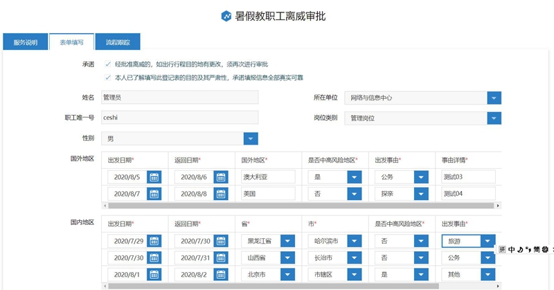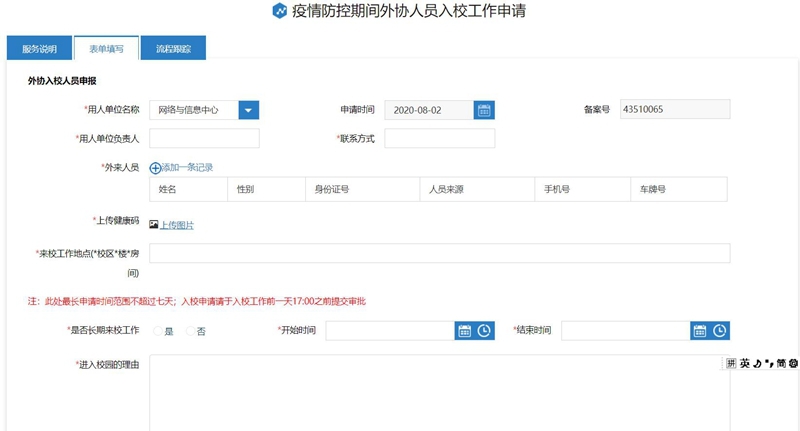 为了简化暑假期间疫情办理相关手续,经过学校防控工作领导小组研究,暑假期间外协人员入校审批及教职工离威在线审批在网上进行,相关业务工作流程经学校网络与信息中心开发已经部署到学校信息门户和微信服务大厅办理。