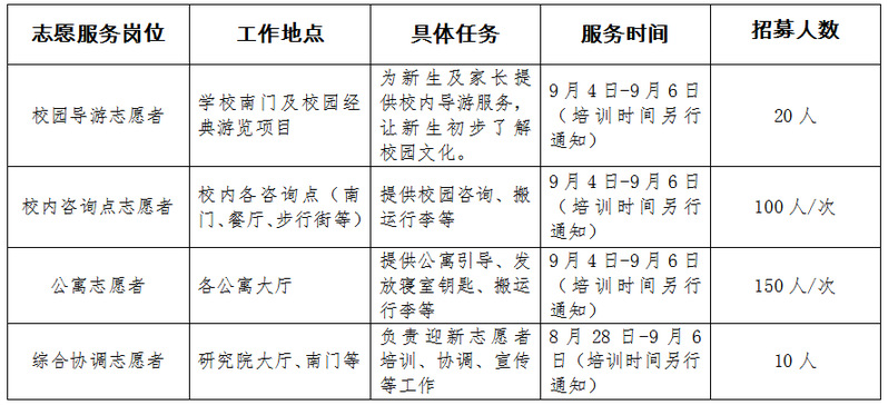 2.此次志愿服务培训时间将根据返校情况,在8月30-94日进行(具体时间和地点另行通知),志愿者应积极参与培训,为新生提供热情、周到的服务;
