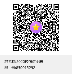 群号:850015292,群名:2020校演讲比赛,随时关注群内比赛通知,群二维码: