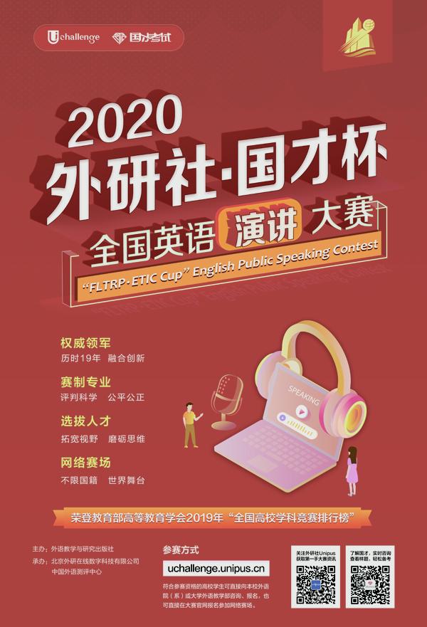 2020“外研社·国才杯”全国英语演讲大赛并行开展地面赛场(校选赛)和网络赛场,同学们可同时报名参加,增加晋级机会!