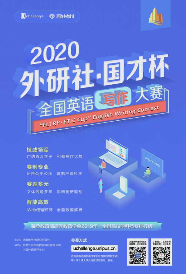 “Uchallenge大学生英语挑战赛”包括“外研社・国才杯”全国英语演讲、写作、阅读三个比赛,是由外语教学与研究出版社、教育部高等学校大学外语教学指导委员会、教育部高等学校英语专业教学指导分委员会和中国外语与教育研究中心联合主办,北京外研在线数字科技有限公司和中国外语测评中心联合承办的公益赛事。