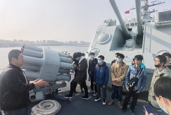 在驱逐舰上,同学们实地参观了驱逐舰的主炮、防空雷达、防空火箭发射装置等海军武装力量,学习了驱逐舰的作战方式、独特的雷达勘测定位装置原理,深入了解了这艘驱逐舰的光荣历史和此型号驱逐舰在我国海军史上曾发挥的重要作用等。