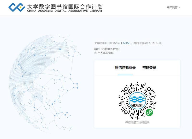 首次使用CADAL需先注册个人账号。访问地址:http://cadal.edu.cn/。点击页面右上角“注册/登录”按钮进行注册和登录操作。注册后支持微信扫码和账号密码登录。