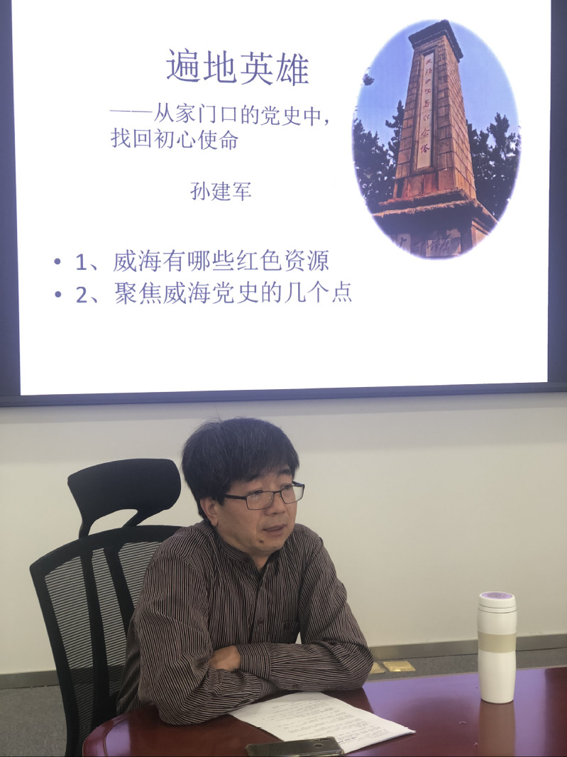 孙建军老师通过多年实地探访,收集整理了大量珍贵的资料。通过丰富详实的史料,有力地驳斥了国民党领导胶东抗战的荒谬言论,真实再现了红色胶东土地上共产党领导抗战可歌可泣的历史篇章。从胶东特委领导年龄、学历、抗战遗存碑记、无名烈士四个角度列举生动事例,畅谈党史学习的个人感悟:学史明理,要树立正确的历史观、价值观,不可以偏概全,更不可一叶障目;学史增信,既要从学习中增强信心,也要汲取信仰的力量;学史崇德,要以革命先辈的崇高品德为镜,提升个人修养;学史力行,在个人工作岗位上,沿着先辈足迹践行共产党员的初心和使命。