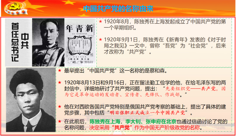 中国共产党中国共产党的诞生是中国革命发展的客观需要,是马克思主义同中国工人运动相结合的产物。1840年鸦片战争以后,半殖民地半封建社会。从鸦片战争到中日甲午战争到五四运动,中国人民为了反对帝国主义和封建统治进行了英勇不屈的斗争,其中主要的是太平天国农民战争和资产阶级领导的辛亥革命,但都相继失败了。历史证明,中国的农民阶级和民族资产阶级由于他们的历史局限性和阶级局限性,都不能领导民主革命取得胜利。1921年7月23日-31日,在上海召开了中国共产党的第一次全国代表大会。这次大会,宣告了中国共产党的成立。中国共产党的诞生是中国社会政治经济发展的必然结果,是近代中国革命的一个转折点,是中国共产主义运动的伟大开端,她的成立具有伟大的历史意义。