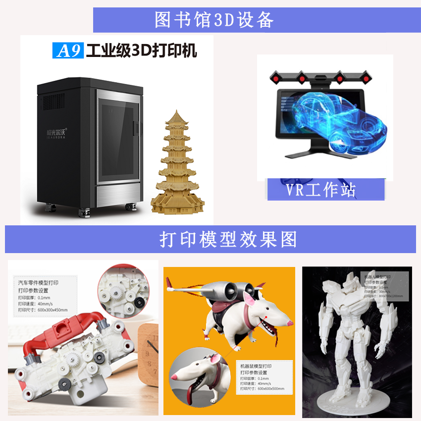 图书馆3D打印配套设备有:极光尔沃工业3D打印机,Voxel Station工作站,AR/VR体验眼睛,建模软件平台等。