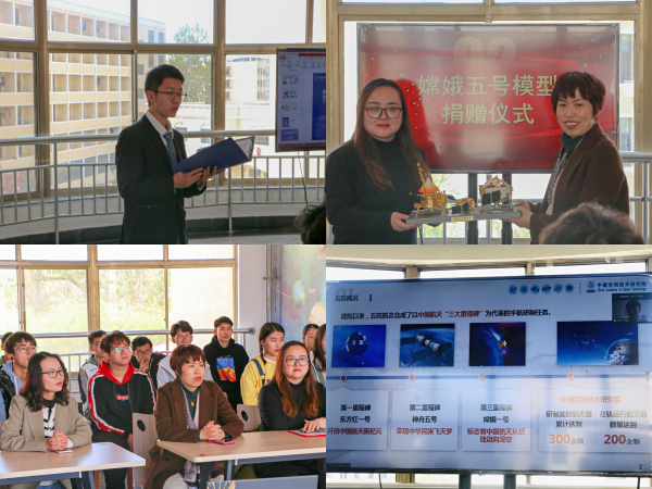 海棠书院学生代表冯亦特首先对中国航天日进行了介绍,向同学们科学普及了航天知识,使同学们对中国航天日有了更深刻的了解。捐赠仪式上,由校友赵玺在校期间辅导员李爱华代表校友同赵婷进行模型交接。赵玺通过视频连线的方式,为同学们进行了航天知识的科普,系统且详细地讲解了我国目前航天事业发展以及未来的规划,最后表达了对同学们的殷切期望,希望同学们能努力学习,将来从事航天事业报效祖国。