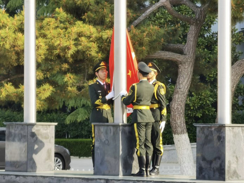 迎着初升的朝阳,伴着国旗仪仗队铿锵有力的步伐,护送鲜艳的五星红旗进场。海洋学子们在嘹亮的国歌声中,庄重地注视着五星红旗冉冉升起,迎风飘扬。