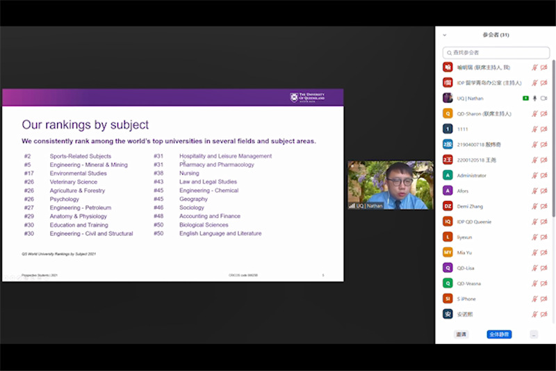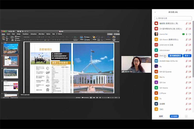 上午的讲座环节,6所名校的招生负责人轮番登场,依次为校区学子带来精彩的讲解。招生负责人分别就所属院校的基本概况、招生政策、奖学金申请资格、费用情况等做了详细的说明。下午,招生负责人和有意向申请海外留学的学生进行了一对一的在线互动,回答了学生提出的有关留学的问题。