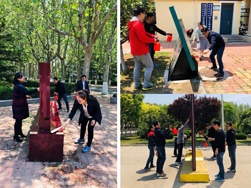 5月19日上午,教务党支部开展第二次“擦亮工大,追求卓越”党日活动。党员、积极分子和递交入党志愿书的群众积极参加,提前准备好工具,从繁忙的工作中暂时抽身出来,来到教务党支部负责擦亮工作的“责任田”——位于主楼广场、正门处的7处校园文化景观,这里分散着学校平面标识、社会主义核心价值观、百年校庆纪念牌、问天树等标识牌。