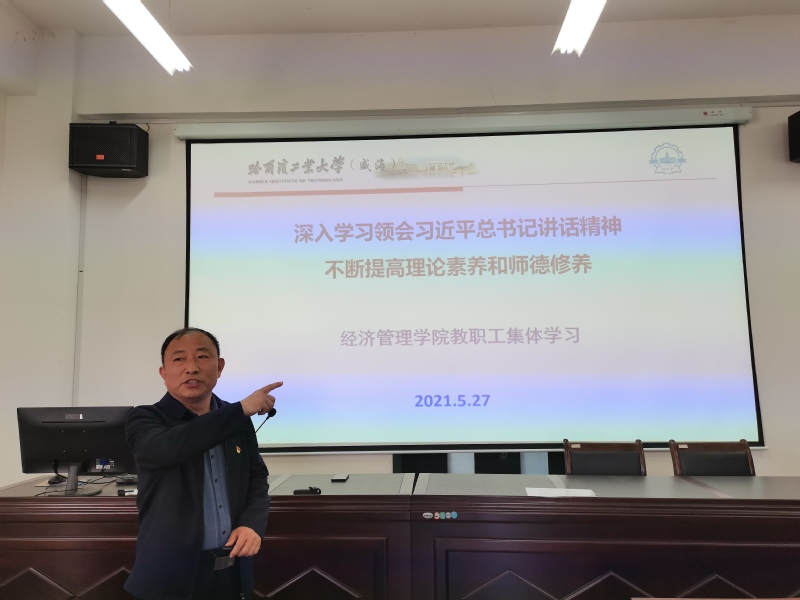 5月27日,经济管理学院教职工理论学习专题会在研学楼南518室举行,院长韩东平主持会议,党委书记胡永河以《深入学习领会习近平总书记讲话精神 不断提高理论素养和师德修养》为题进行学习串讲,全体教职工参加会议。