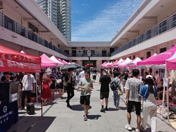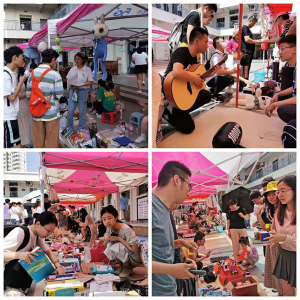 每天跳蚤市场开市的时候,通过线上渠道报名的“摊主”会带着自己要出售的物品前往大学生服务区中心广场。他们在工作人员提前布置好的摊位上摆放物品进行出售,各个“摊主”都对活动抱有极大的热情,在工作人员的维持下,市场秩序井然,同学们的交易都在如火如荼地进行着。