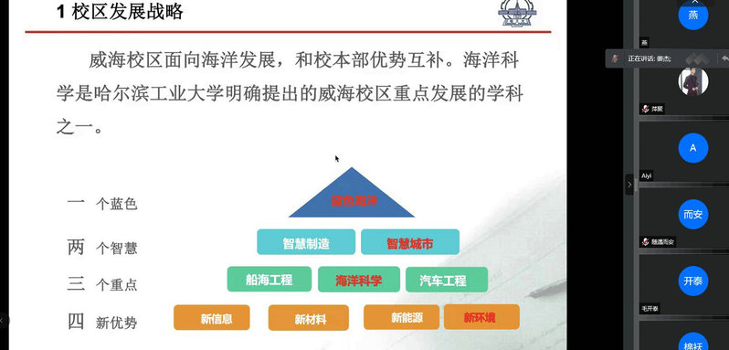 姜杰从校区发展战略、学院情况、人才培养、就业现状做了详细介绍,威海校区面向海洋发展,而海洋科学是威海校区的重点学科之一,学院注重德才兼修、理论与实践相结合的人才培养模式,希望将本科生塑造成为具有扎实基础和国际视野的一流人才。同时希望家长能够与学院积极沟通,督促学生养成良好习惯,确立共同发展目标,一起助力学生的全面成长。