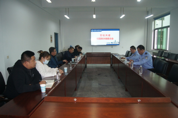 警校共建校园防诈骗安全教育工作座谈会于10月12日下午在主楼229会议室召开,校区党委副书记、副校长赵国亮,金海滩派出所所长王天秀,后勤保卫处处长林建秋、副处长毛凤虎及驻校民警、学生工作处、保卫办公室相关工作人员参加了座谈。