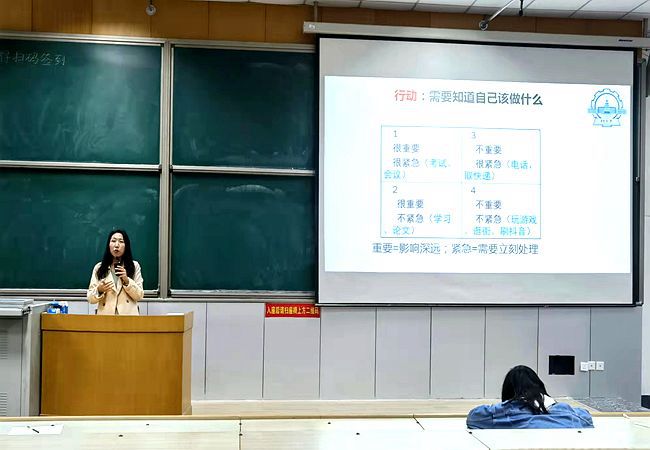 王莹指出学生会的学生干部和班委成员是学生中的精英骨干,是老师们的得力助手,也是校园文化建设和班级建设的具体组织者。学生干部除了要有奉献精神和吃苦耐劳的品质外,还需要有良好的组织管理能力、团队合作能力、沟通能力和创新能力,组织此次学生干部培训的目的就是要提高学院和书院学生干部队伍的综合素质。她从“有效的团队沟通”和“完美执行力打造”两方面系统阐述了如何高质高效地完成工作。她分别讲解了下级对上级之间、平级之间和上级对下级之间的沟通原则和沟通技巧,并且举出多个高效沟通的实例;然后从主动、服从、创新、行动四个方面讲解了完美执行力打造的方法。她强调执行文化的形成就是要把复杂的事情简单化,把简单的事情标准化,把标准的事情习惯化,把习惯的事情制度化。