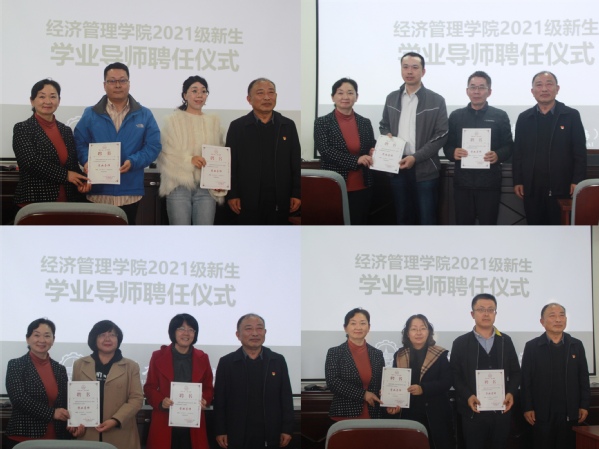 经济管理学院院长韩东萍、党委书记胡永河为各位学业导师颁发了聘书并进行合影留念。会后,邓平平指导2021级宿舍长与学业导师进行了初步沟通。