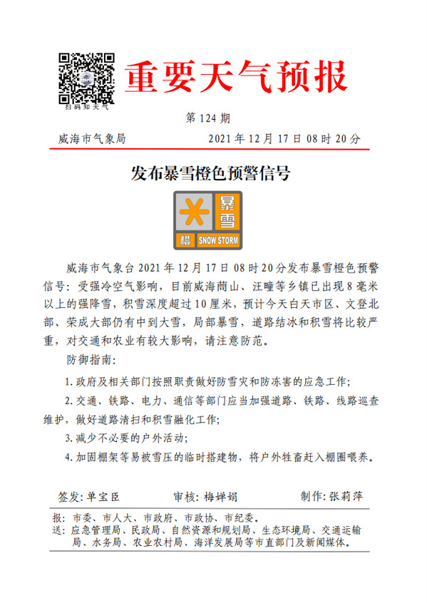 威海市气象台2021年12月17日08时20分发布暴雪橙色预警信号:受强冷空气影响,目前威海蔄山、汪疃等乡镇已出现8毫米以上的强降雪,积雪深度超过10厘米,预计今天白天市区、文登北部、荣成大部仍有中到大雪,局部暴雪,道路结冰和积雪将比较严重,对交通和农业有较大影响。请各单位及广大师生高度重视,密切关注天气变化,注意防范:
