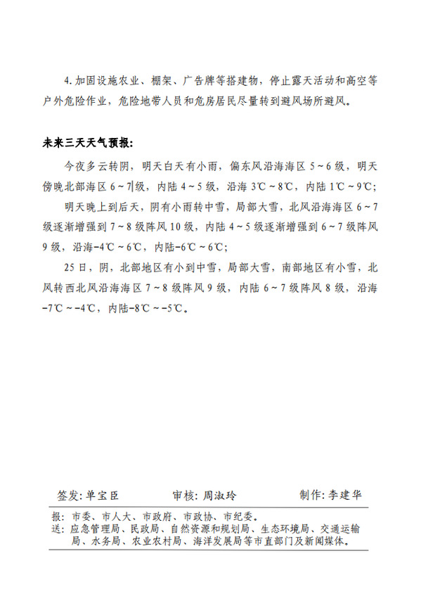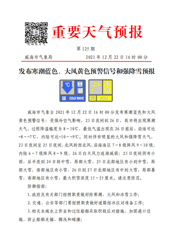威海市气象台2021年12月22日16时00分发布寒潮蓝色和大风黄色预警信号:受强冷空气影响,23日夜间到26日,我市将出现寒潮 天气,过程降温幅度为8~10℃,最低气温出现在26日前后,沿海可达-8~-7℃,内陆可达-10~-9℃。同时伴有明显的大风和强降雪天气,23日夜间至25日夜间,北风转西北风,沿海海区7~8级阵风9~10级,内陆6~7级阵风8~9级,26日白天风力逐渐减弱;23日夜间阴有小雨,后半夜到24日转中雪,局部大雪,25日北部地区有小到中雪,局部大雪,南部地区有小雪,26日到 27日北部地区有中到大雪,局部暴雪,南部地区有小雪,最大积雪深度15~25厘米。