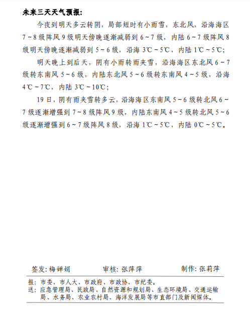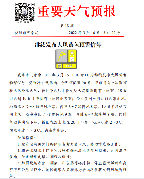 威海市气象台2022 年3 月16 日16 时00 分继续发布大风黄色预警信号:受强冷空气影响,今天夜间至20 日,我市将有一次雨雪和大风降温天气。预计今天后半夜到明天局部短时有小雨雪18日白天到19日,上午阴有小雨转雨夹雪;今天夜间至明天白天东北风,沿海海区7~8级阵风9级,内陆6~7级阵风8级,19日早晨到夜间北风,沿海海区7~8级阵风9级,内陆6~7级阵风8级;同时气温将明显下降,最低气温出现在20日早晨,沿海可达-2~0℃,内陆可达-4~-3℃。