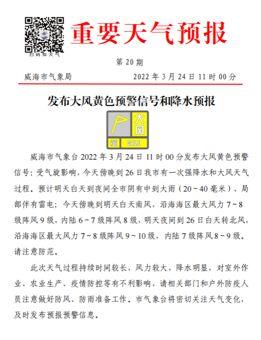威海市气象台2022 年3 月 24日 16 时00 分发布大风黄色预警信号:受气旋影响,今天傍晚到26日我市有一次强降水和大风天气过程。预计明天白天到夜间全市阴有中到大雨(20~40毫米),局部伴有雷电;今天傍晚到明天白天南风,沿海海区最大风力7~8级阵风9级,内陆6~7级阵风8级,明天夜间到26日白天转北风,沿海海区最大风力7~8级阵风9~10级,内陆7级阵风8~9级,请各单位及广大师生高度重视,密切关注天气变化,注意防范: