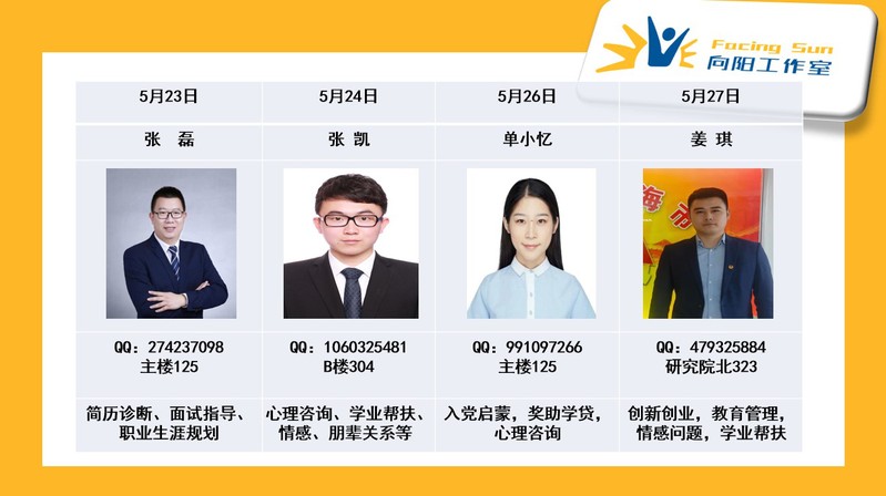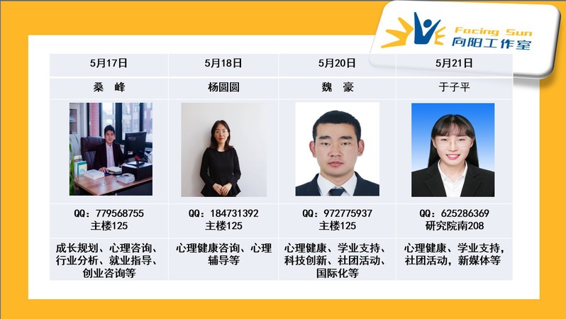 线下咨询:学生可在每个值班日的18:30-20:30到指定咨询室,与咨询师面对面交流。8位由校内老师、校外心理专家和就业指导专家组成的咨询师团队静待同学们的来访。