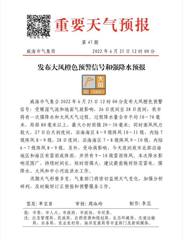 威海市气象台2022年6月25日12时00分发布大风橙色预警信号:受暖湿气流和地面气旋影响,26日夜间至28日夜间,我市将有一次强降水和大风天气过程。过程降水量全市平均50~70毫米,局部 80毫米以上,最大小时雨强20~30毫米;同时南风风力较大,27 日白天到夜间,沿海海区8~9级阵风10~11级,内陆7级阵风8~9级,28日夜间,沿海海区7~8级阵风9~10级,内陆6~7级阵风8~9级。另外,受冷涡影响,今天夜间我市北部沿海地区和海区有雷雨或阵雨,并伴有9~10级雷雨阵风。本次降水影响范围广、持续时间长、短时雨强大。