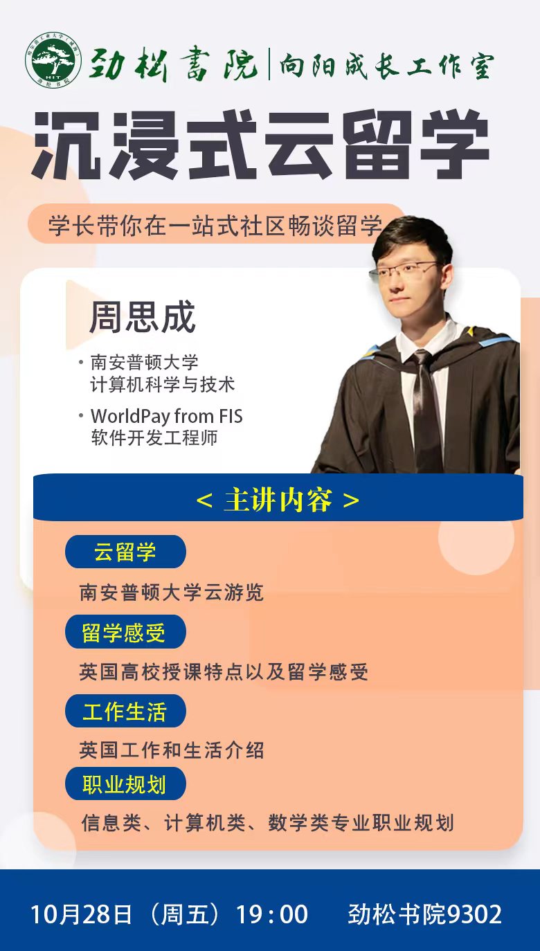 此次“沉浸式云留学”邀请到目前就读于南安普顿大学的周思成学长,他将带领大家一起云游览南安普顿大学,并就英国高校的工作、学习、生活以及留学感受与大家进行分享,帮助同学们更好的做好关于留学的职业规划。