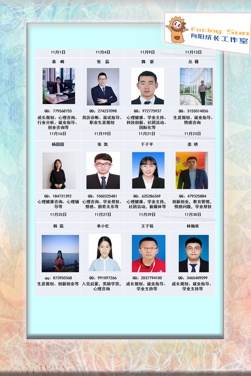 向阳成长工作室大焕新啦!经过为期2个月装修布置,向阳成长工作室正式入驻劲松书院。温馨的装修、舒适的环境、先进的设备,14位心理辅导和就业指导老师组成的咨询师“天团”恭候同学们来访。