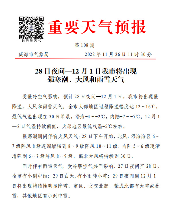 强寒潮期间伴有大风天气:28日下午开始,北风,沿海海区6~7级阵风8级逐渐增强到8~9级阵风10~11级,内陆5~6级逐渐 增强到6~7级阵风8~9级,偏北大风将持续到30日。同时伴有雨雪天气:受冷暖空气共同影响,27日夜间至28日,全市有小到中雨;29日白天,有小雨转小雪;29日夜间到12月 1日将出现持续性明显降雪,市区北部有大雪或暴雪,其他地区有小到中雪。