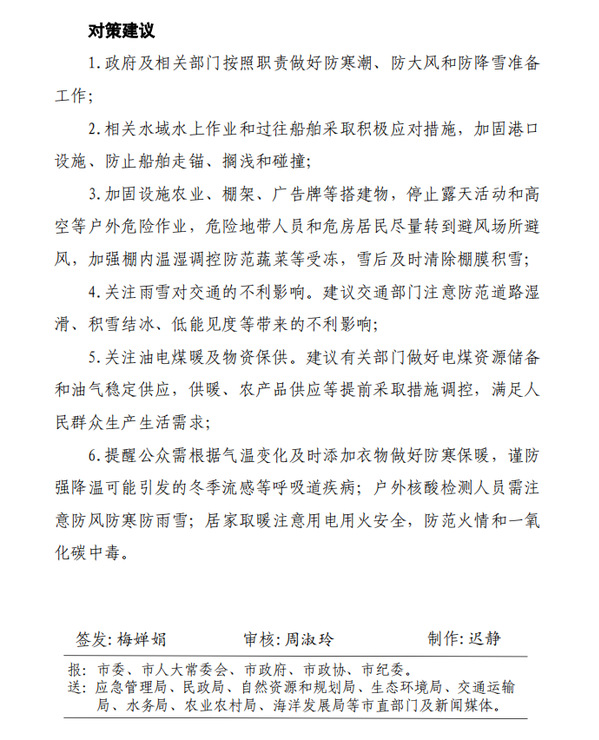 各部门要做好防范强寒潮、大风和雨雪天气的应急工作。