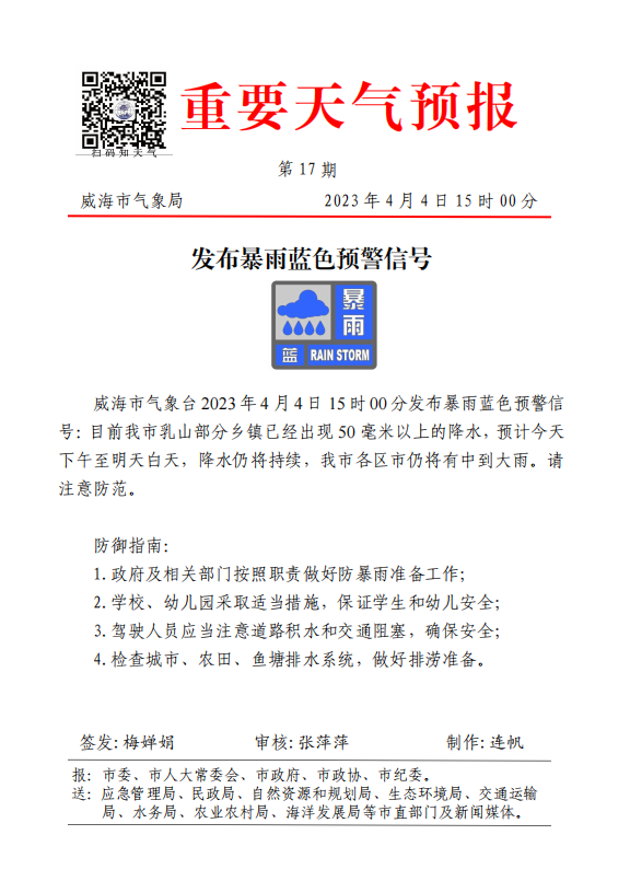 威海市气象台2023年4月4日15时00分发布暴雨蓝色预警信号:目前我市乳山部分乡镇已经出现50毫米以上的降水,预计今天下午至明天白天,降水仍将持续,我市各区市仍将有中到大雨,请注意防范。请各单位及广大师生高度重视,提前做好防范暴雨蓝色预警信号的工作,密切关注天气变化,注意防范: