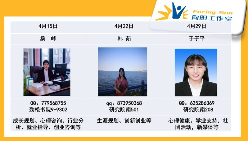“向阳成长工作室”4月份活动打卡开始了!本月除开展常态化咨询以外,还针对同学们关心的留学问题进行解答。专业的心理辅导和就业指导老师及3位offer 大佬组成的咨询师“天团”恭候同学们来访。