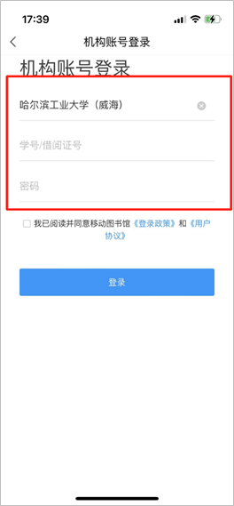 点击进入移动图书馆APP,点击下方的其他登录方式,输入单位哈尔滨工业大学(威海),用户名为学号/工号,密码为姓名首字母+学号/工号(例如ABC12345678)。