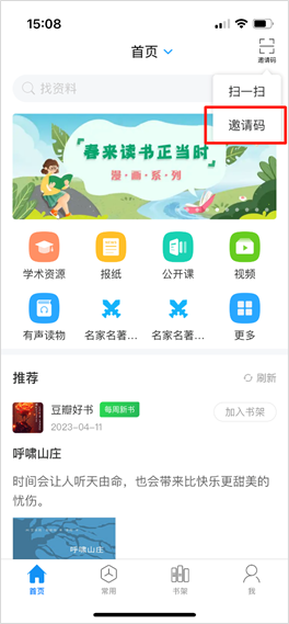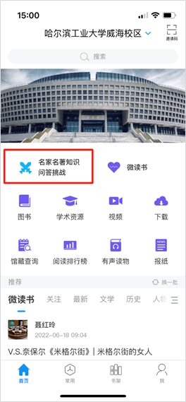 首页右上角,点击邀请码,输入“hitwhtsg”,进入图书馆页面后,点击“名家名著知识挑战”活动模块,开始答题挑战。