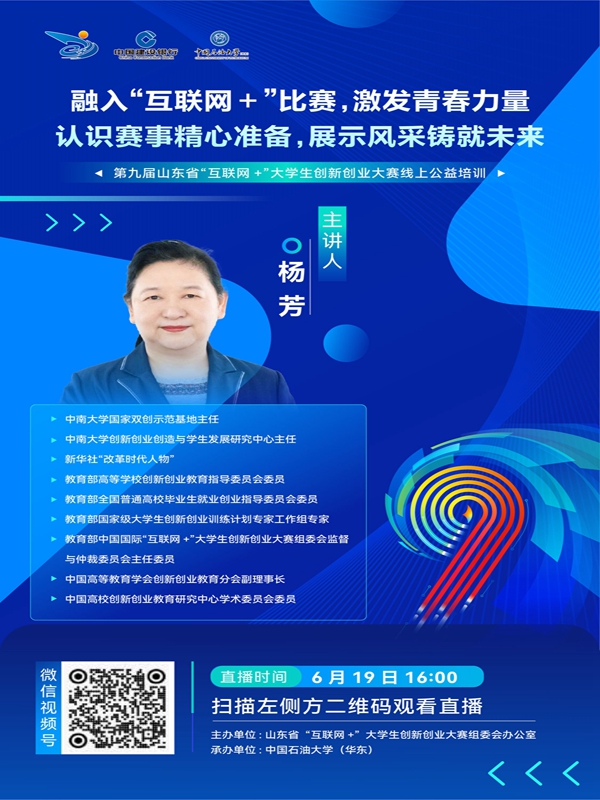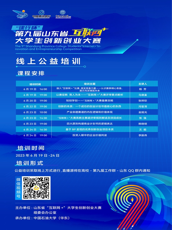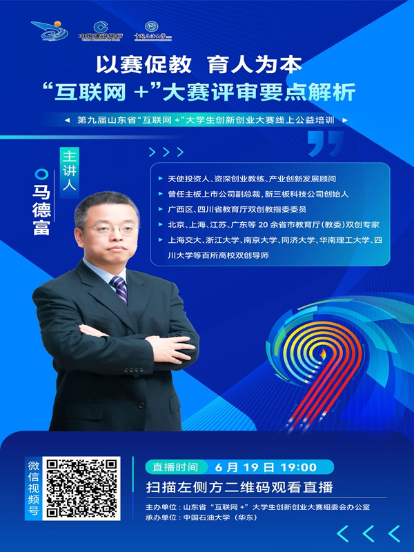 为进一步做好第九届山东省“互联网+”大学生创新创业大赛项目挖掘和培育工作,全面提升教师对参赛项目的指导水平,特邀部分知名评审专家对大赛准备、项目优化与培育等进行线上指导。具体安排如下: