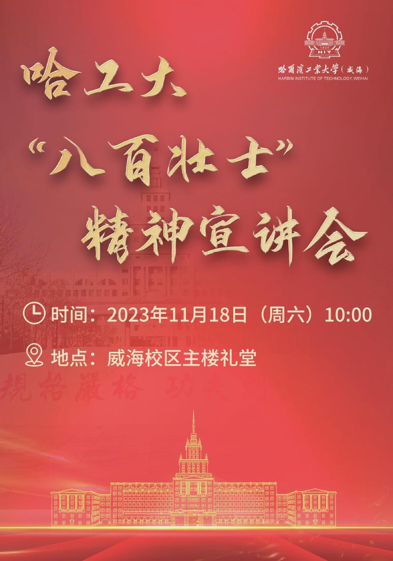11月18日(本周六)上午10:00,哈工大“八百壮士”精神宣讲会将在威海校区举行。6位宣讲人将讲述老一辈哈工大“八百壮士”爱国奋斗、建功立业的动人故事,激励引领新时代哈工大人茁壮成长、屡创佳绩、英雄辈出。