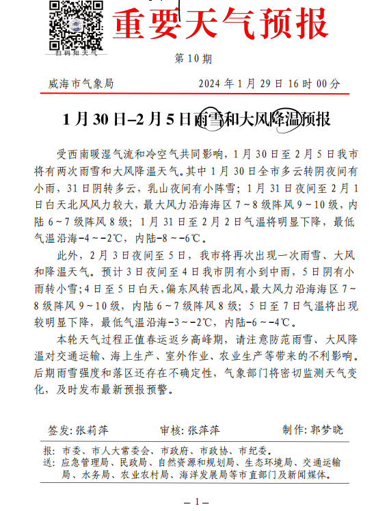 受西南暖湿气流和冷空气共同影响,1月30日至2月5日我市将有两次雨雪和大风降温天气。其中1月30日全市多云转阴夜间有小雨,31日阴转多云,乳山夜间有小阵雪;1月31日夜间至2月1日白天北风风力较大,最大风力沿海海区7~8级阵风9~10级,内陆6~7级阵风8级;1月31日至2月2日气温将明显下降,最低气温沿海-4~-2℃,内陆-8~-6℃。