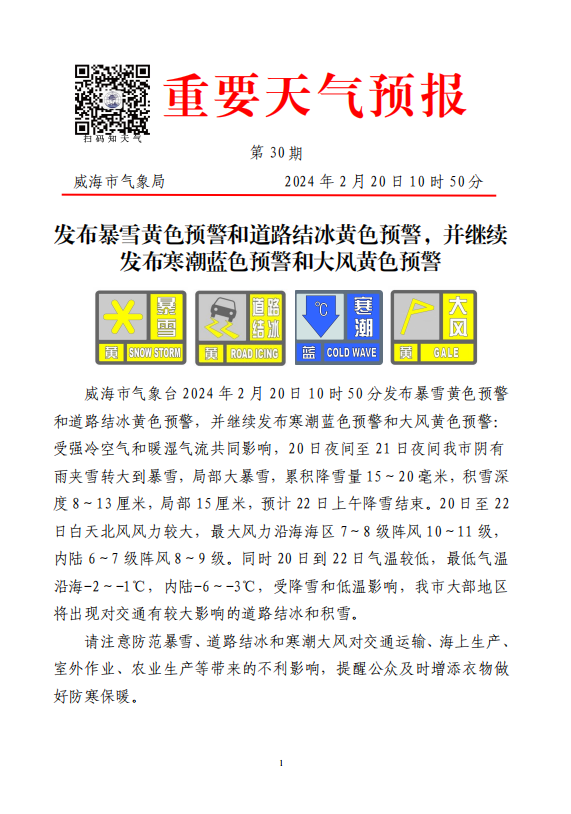 威海市气象台 2024 年 2 月 20 日 10 时 50 分发布暴雪黄色预警和道路结冰黄色预警,并继续发布寒潮蓝色预警和大风黄色预警:受强冷空气和暖湿气流共同影响,20 日夜间至 21 日夜间我市阴有雨夹雪转大到暴雪,局部大暴雪,累积降雪量 15~20 毫米,积雪深度 8~13 厘米,局部 15 厘米,预计 22 日上午降雪结束。20 日至 22日白天北风风力较大,最大风力沿海海区 7~8 级阵风 10~11 级,内陆 6~7 级阵风 8~9 级。同时 20 日到 22 日气温较低,最低气温沿海-2~-1℃,内陆-6~-3℃,受降雪和低温影响,我市大部地区将出现对交通有较大影响的道路结冰和积雪。