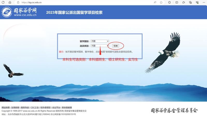 项目详细信息可参见《国家公派出国留学项目一览表(攻读硕士学位研究生、本科插班生类别)》(附件1),也可通过https://bg.csc.edu.cn查询。查询页面如下图所示: