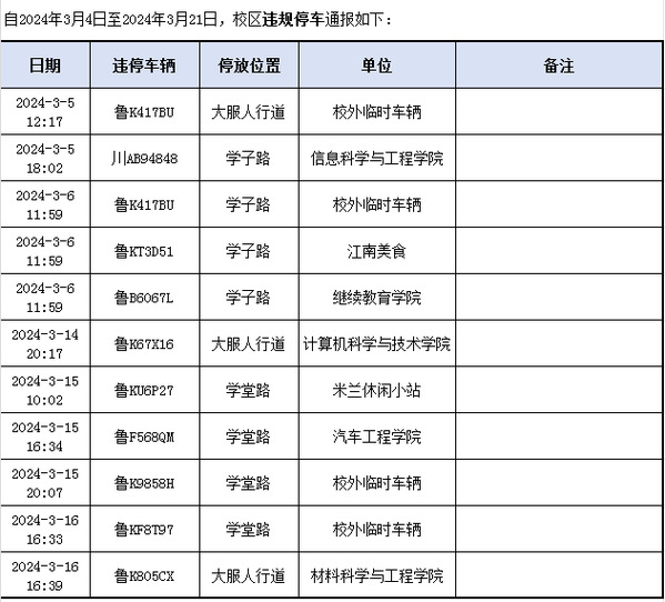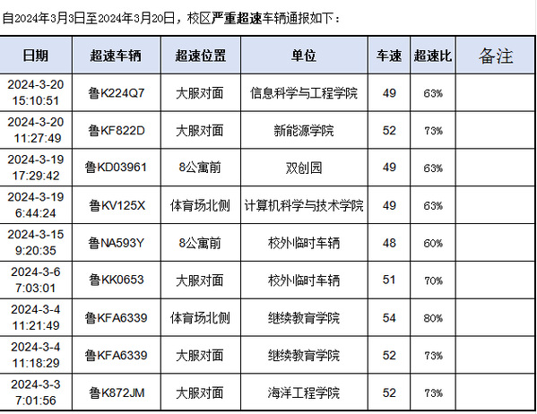 (一)超速或违停一次,在校区网通报车牌号及所属单位;