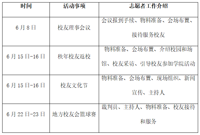 欢迎有责任心、志同道合、有志愿精神的同学们积极报名,共同为校区校友工作贡献一份力量,校友活动月期待您的加入!