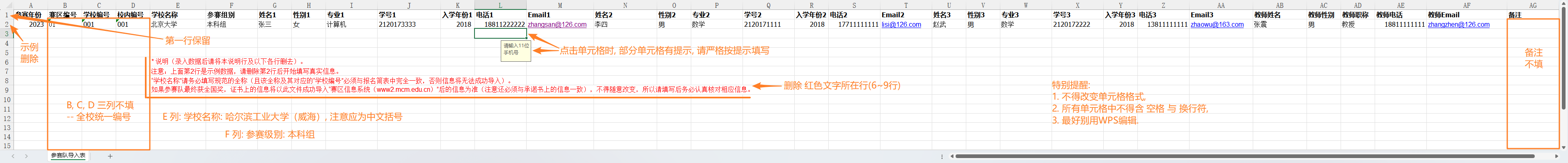 请参照填表说明和表中示例严格按要求填写参赛队导入表,不得改变单元格格式,其中,学校名称:哈尔滨工业大学(威海),赛区编号、学校编号、校内编号不填。