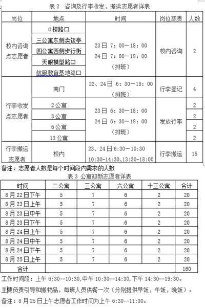 公寓迎新志愿者 | 新生公寓 | 负责引导和搬物品 | 8.22-8.25 | 见表3 |