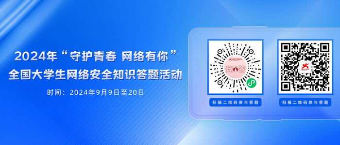 9月9日至20日,通过中国大学生在线官网(dxs.moe.gov.cn)或“中国大学生在线”微信公众号,参加“守护青春 网络有你”全国大学生网络安全知识答题活动。