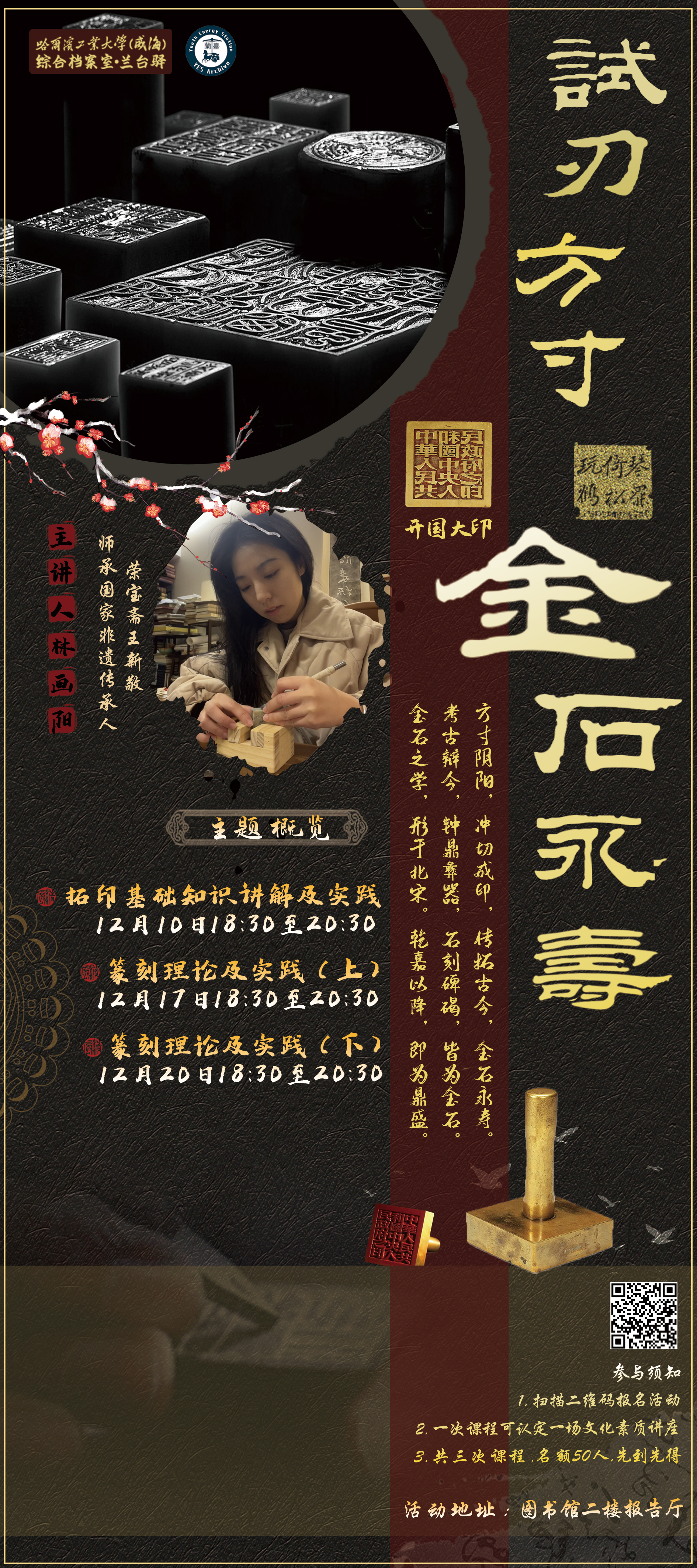 “兰台驿”在继档案修复、古籍修复和字画装裱系列后,隆重推出拓印和篆刻主题系列文化活动,此次活动不仅包含“兰台驿”传统项目——理论加实践的讲座培训,还新增了技艺体验区——流动驿站项目,另外培训结束时非遗传统技艺研习基地——“兰台驿工作坊”将同步对外揭牌工作。方寸之间,阴阳相济,冲切成印,不仅是对美的追求,亦是对历史文化的致敬,期待师生的参与。