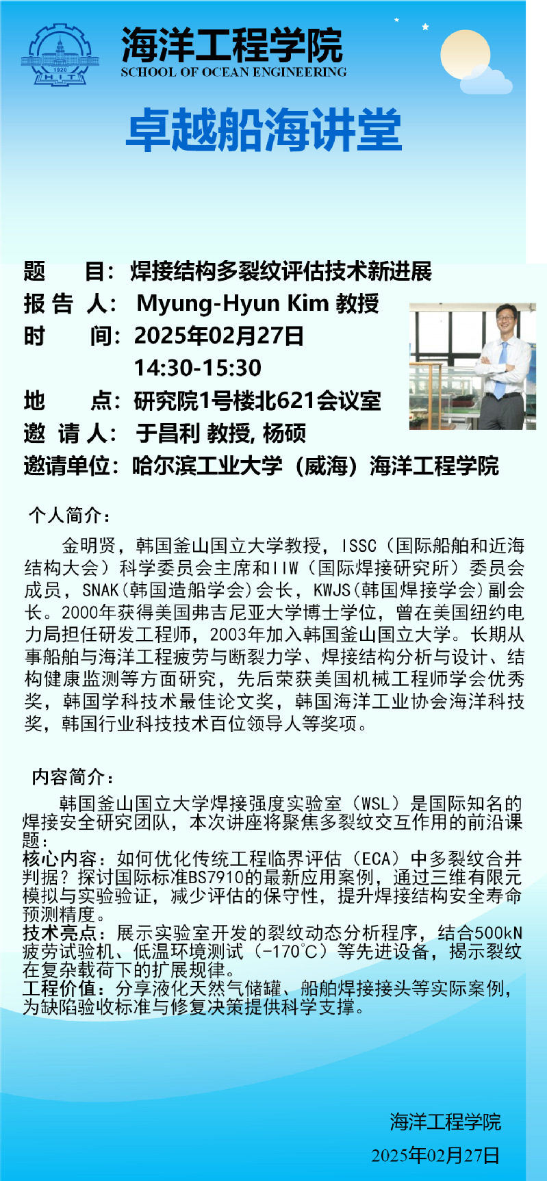 报告简介:韩国釜山国立大学焊接强度实验室(WSL)是国际知名的焊接安全研究团队,本次讲座将聚焦多裂纹交互作用的前沿课题: